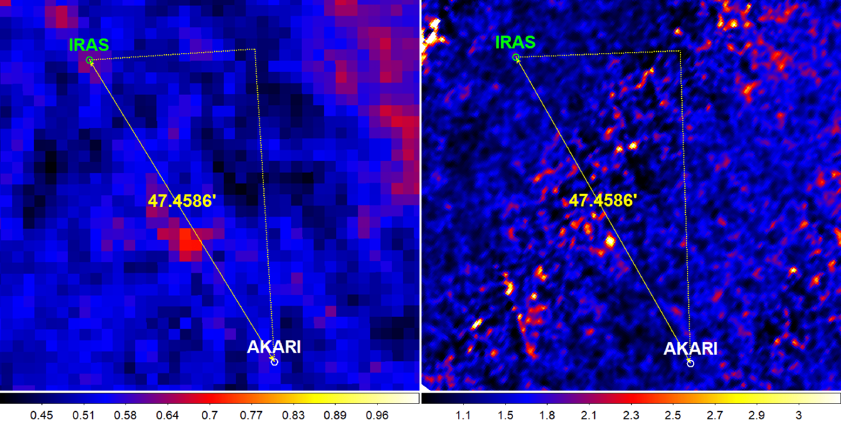 Местоположение кандидата в Девятую планету на снимках IRAS (слева) и AKARI (справа).