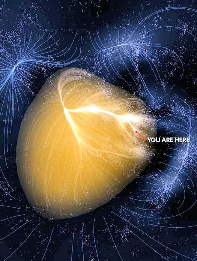 Ланиакея (желтым), которую словно окутывает Великая Стена Геркулеса — Северной Короны (белым). Источник: NASA