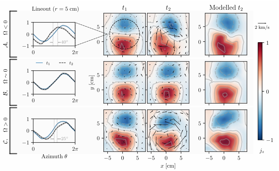 Цветовая карта нормализованного осевого тока j_z в плоскости (xy) вокруг центра антенны (x_a, y_a) = (0.7, 2.5) см на порту #32 для заданной фазы волнового цикла: до приложения смещения (t1, левый столбец), во время активного смещения (t2, средний столбец) и для случая, реконструированного по теории (правый столбец). Для двух левых столбцов наложенные стрелки показывают скорость, рассчитанную по плавающему потенциалу в те же моменты времени. Графики плотности тока (lineouts) слева, рассчитанные вдоль пунктирной окружности, показанной на карте вверху слева, демонстрируют азимутальный сдвиг токовых каналов во время приложения смещения; при этом серая заливка указывает на вариации менее 5%, измеренные на протяжении десяти волновых циклов. Каждая строка соответствует отдельному сценарию приложения смещения. arXiv:2505.18062 [physics.plasm-ph]Автор: Renaud Gueroult et al Источник: arxiv.org