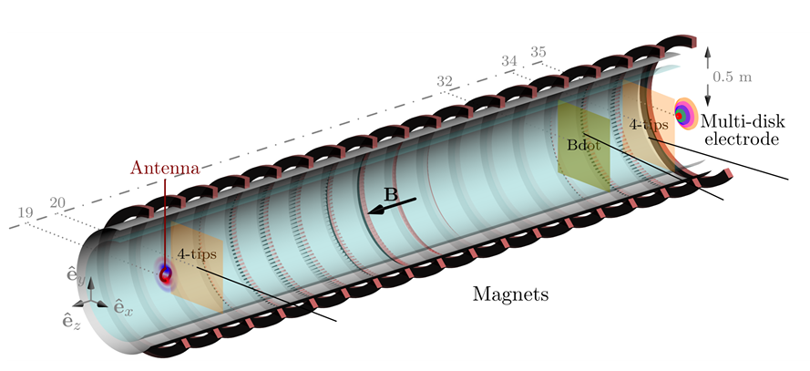Экспериментальная установка на LAPD. Волны генерируются одиночной петлевой антенной на порту #19, при z = -6.3 м. Многодисковый электрод (MDE), установленный на порту #35 (z = -11.66 м), используется для управления вращением плазмы. Параметры волны и плазмы диагностируются в трёх осевых положениях (#20, #32 и #34) вдоль участка плазменного столба. arXiv:2505.18062 [physics.plasm-ph]Автор: Renaud Gueroult et al Источник: arxiv.org