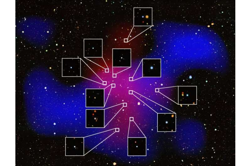 Самое плотное скопление сверхмассивных чёрных дыр, обнаруженное во Вселенной. Фоновое изображение было получено с помощью камеры Hyper Suprime-Cam на телескопе Subaru. Красные и синие тени обозначают плотность сверхмассивных чёрных дыр (квазаров) и окружающих их сотен молодых галактик, в которых происходит звездообразование. Белые квадраты обрамляют квазары, а квадраты большего размера показывают изображения крупным планом. Источник: телескоп Subaru / SDSS, Лян и др.