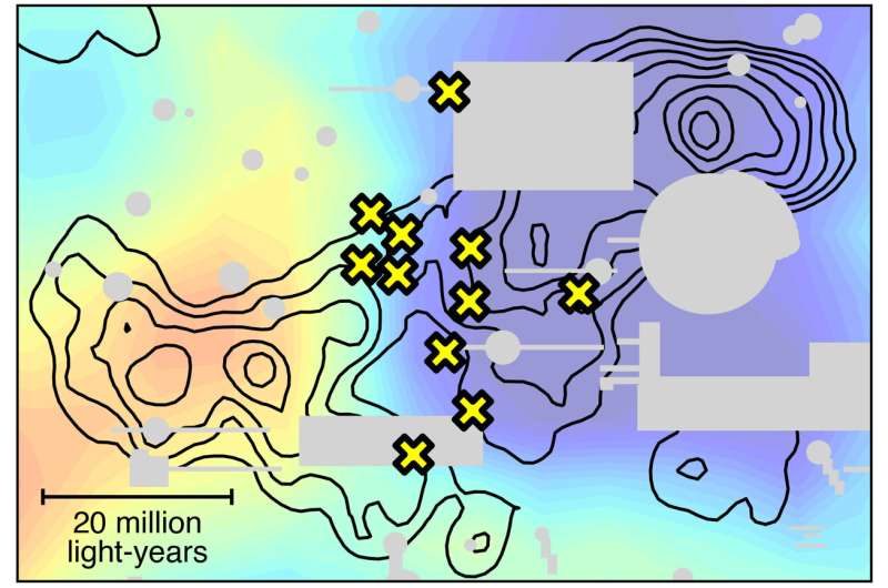 «Космические Гималаи» — массивное скопление энергичных квазаров, формирующих космический ландшафт. Жёлтыми крестиками отмечены положения квазаров. Цветовая шкала показывает плотность нейтрального водорода: красный цвет означает высокую плотность, а синий — низкую, то есть синяя область богата ионизированным газом. Таким образом, нейтральный газ концентрируется в левом скоплении галактик, а ионизированный газ — в правом. Чёрными контурными линиями показана плотность галактик. Серые области — это замаскированные участки из-за плохой мозаики изображений или насыщенности вблизи ярких звёзд. Источник: телескоп Subaru / SDSS, Лян и др.