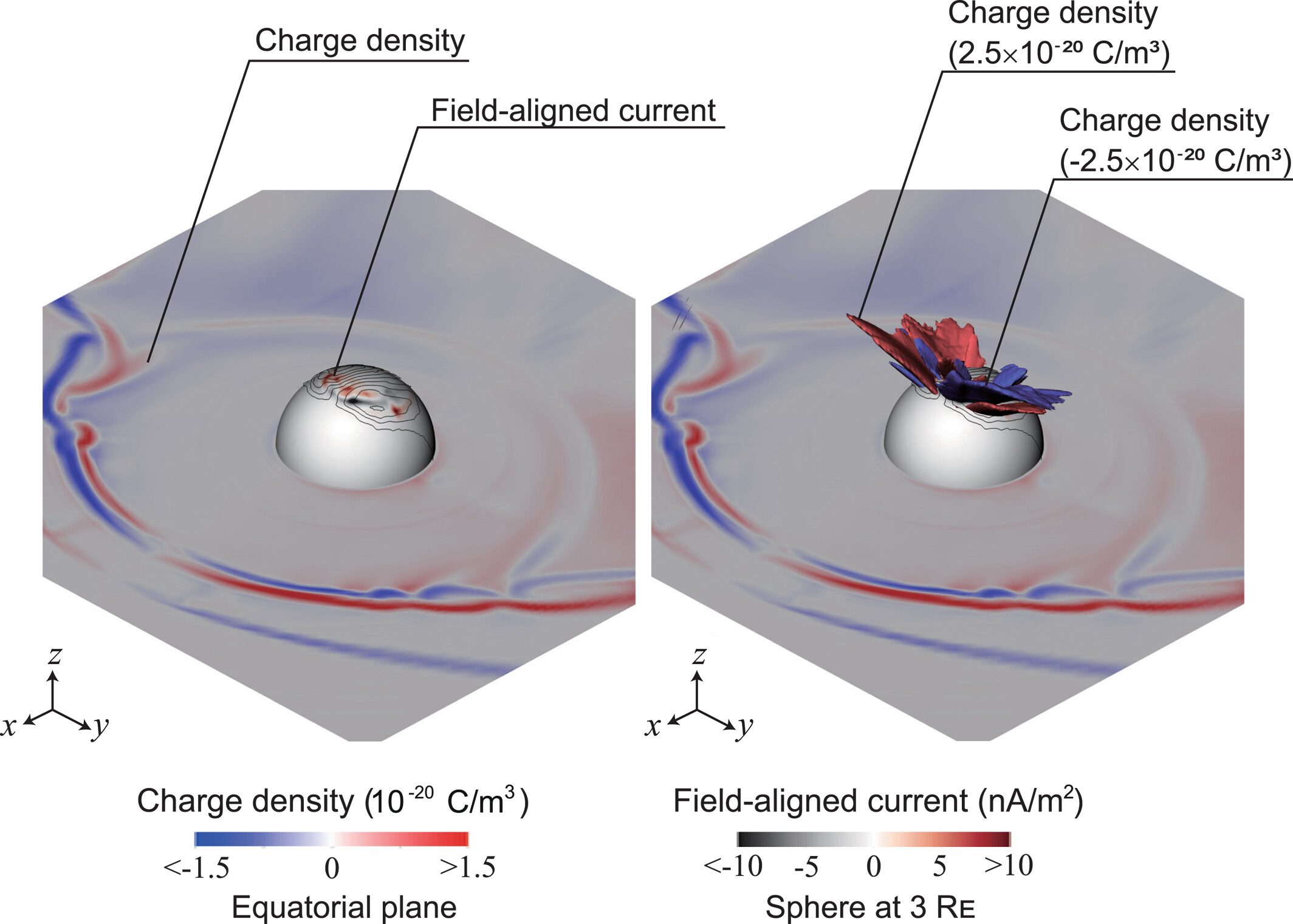 Перспективный вид магнитосферы с дневной стороны. Цветовая схема на экваториальной плоскости обозначает плотность заряда ρ, а на сфере радиусом 3 Rₑ — продольные токи (положительные — направленные вниз). На правой панели красноватые (голубоватые) изоповерхности указывают на плотность заряда +2.5 x 10⁻²⁰ Кл/м³ (-2.5 x 10⁻²⁰ Кл/м³). Чёрные контурные линии на сфере обозначают эквипотенциаль, спроецированную из ионосферы вдоль дипольного магнитного поля.