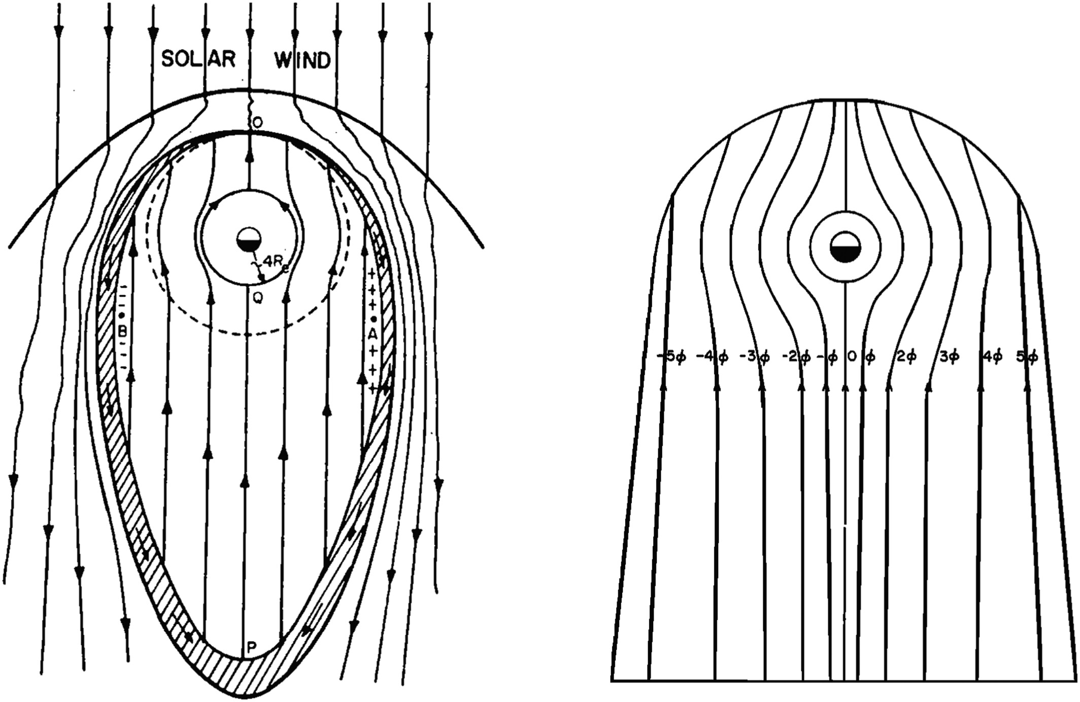 Схема магнитосферы, (слева) обусловленной вязкими взаимодействиями с потоками солнечного ветра (Axford, 1964), и (справа) обусловленной пересоединением между магнитным полем Земли и межпланетным магнитным полем (Brice, 1967). Линии со стрелками обозначают линии тока плазмы, а (справа) — эквипотенциальные линии.
