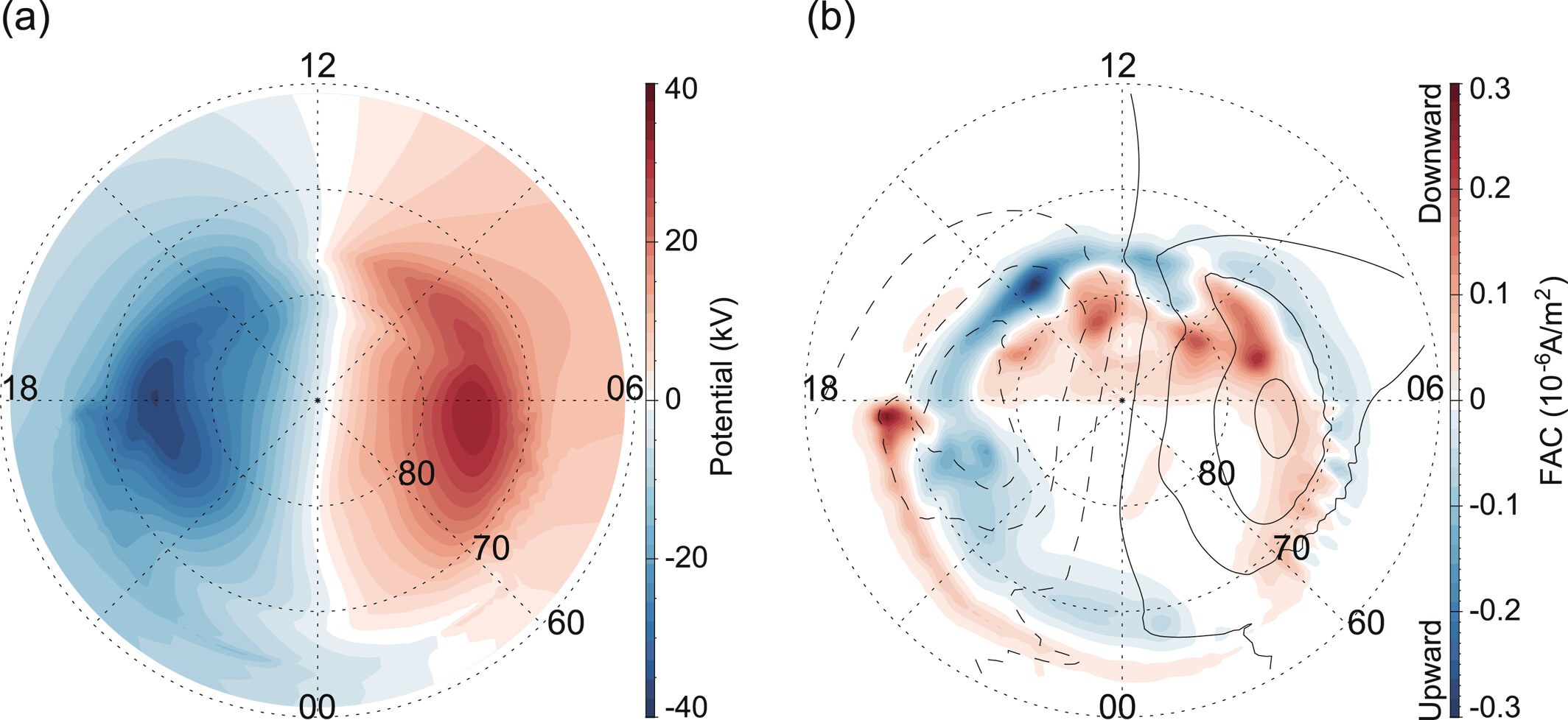 (a) Ионосферный электрический потенциал Φɪ и (b) продольные токи в северной ионосфере в момент времени t = 171 мин (при межпланетном магнитном поле Bz = -5 нТ). Солнце находится вверху. На рисунке (b) сплошные линии обозначают положительный потенциал, а пунктирные — отрицательный. Положительные (отрицательные) токи соответствуют нисходящим (восходящим) токам. Внешняя окружность соответствует магнитной широте 60°.