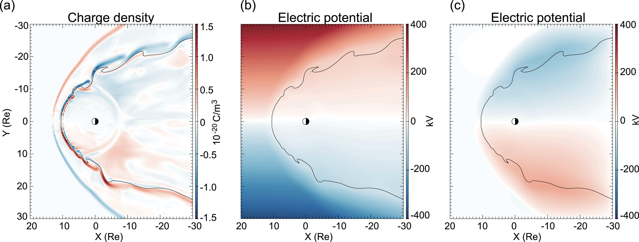 (a) Плотность заряда, полученная по магнитосферному электрическому полю, (b) электрический потенциал Φ₂, полученный решением уравнения Пуассона с граничным условием, определяемым электрическим полем, и (c) электрический потенциал Φ₃, полученный решением уравнения Пуассона с граничным условием, при котором потенциал принят равным нулю. Солнце находится слева. Сплошная линия обозначает Bz = 0, что может служить приближением для магнитопаузы, в частности, на дневной стороне.