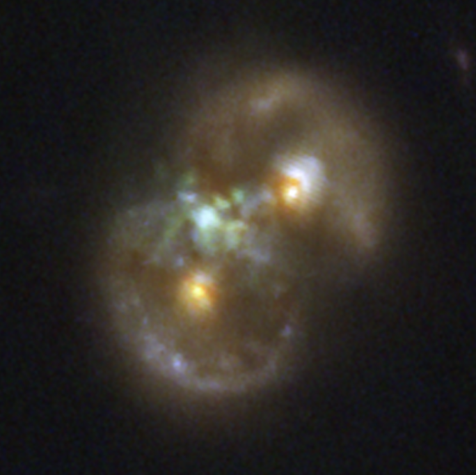 Реально видно, что центры трёх галактик “чёрные дыры” расположены треугольником, но теоретики измыслили, что две галактики сблизились прессуя газ между собой до формирования из него “чёрной дыры” по типу первичных… Бред…
