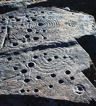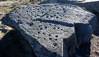 Петроглифы расположены в верхней горизонтальной зоне двух диабазовых скал, на которых изображены фигуры геометрического типа с множеством круглых фигур, простых чашечек или окруженных кольцами. бороздки и шесть лабиринтных фигур. Стиль исполнения – нанесение колышков для углублений и лабиринтов, в то время как на кастрюлях почти нет следов ударов, но их поверхность тонкая и отполированная. Авторы исследования и документации (Кирос и др., 2011) констатируют использование абразии в качестве метода травления, предположительно “с помощью вращающейся литической посуды, которая, образуя кастрюли, также приводила к сглаживанию внутренней поверхности многих из них”.[8]Эти две породы имеют форму, напоминающую форму для запекания. гравюры сильно выветрились из-за эрозии, которой они подвергались на протяжении тысячелетий, поэтому для хорошего наблюдения за фигурами необходимо выбирать условия полного освещения, при которых солнце находится в положении, близком к горизонту. Две основные панели: