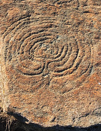 - Пенья Фадиэль II. На второй скале изображены еще три лабиринта, и эта фигура является абсолютным героем этой панели, в которой едва ли найдется пара маленьких кастрюль. В целом они сильно разрушены, поэтому для их наблюдения необходим четкий и ровный свет (например, ранним утром или вечером). Как и в случае с панно Пенья Фадиэль I, три лабиринта имеют разную планировку, с десятью, семью и девятью поворотами или путями соответственно. Разнообразие рисунков явно преднамеренное и придает этим петроглифам большое значение с точки зрения изучения рисунка лабиринта, поскольку нет никаких свидетельств существования какой-либо другой доисторической пещерной станции, на которой было бы представлено такое количество различных фигур и рисунков. [10]