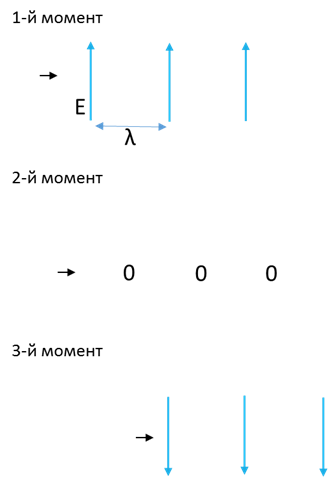 Время, надо сказать игнорируют в волновой теории все время. Сначала рассказывают про изменяющуюся во времени синусоиду, а потом дают ее «моментальную» фотографию, в моменте которой совмещены все четыре периода ее образования.