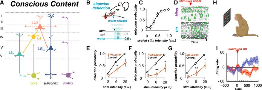 Вклад таламуса в содержание сознания (A) Гипотетический таламокортикальный контур, поддерживающий содержание сознания. Матричные клетки таламуса (фиолетовые) проецируются к апикальным дендритам клеток ttL5B (темно-синие) и пирамидальных клеток L2/3 (оранжевые), а также к косым дендритам клеток ttL5B в слое L5A. Проекции к косым дендритам деполяризуют ствол клетки через действие метаботропных глутаматергических (и холинергических) рецепторов, что, как было предположено и показано, облегчает связь между апикальным и соматическим компартментами, позволяя натриевым спайкам распространяться в обратном направлении от сомы к апикальным дендритам, способствуя генерации кальциевых спайков, и наоборот. И матричные, и ядерные (светло-зеленые) клетки таламуса получают управляющие (драйверные) входы от клеток ttL5B. Ядерные клетки посылают управляющие проекции к IT-клеткам L4 и пирамидальным клеткам L2/3 (не показано). IT-клетки L4 затем формируют замкнутый возбуждающий контур с ядерными клетками через нейроны L6A (голубые). Аналогичным образом, возбуждающий выход из клеток L4 нацелен на базальные дендриты клеток ttL5B через слой L2/3. (B) Иллюстрация парадигмы порогового обнаружения, использованной в исследованиях Takahashi и его коллег.¹⁶,¹⁴⁵ (C) Психометрическая функция, показывающая вероятность ответа (среднее +- SD) как функцию (масштабированной) интенсивности стимула у мышей во время сеансов записи. (D) Пример растровых графиков для сомы клеток ttL5B в пробах с попаданием (hit) и промахом (miss). Редкие вспышки (зеленый цвет) происходят в обоих условиях, но в пробах с попаданием они синхронизированы по времени с началом стимула. (E-G) Вероятность обнаружения (среднее +- SEM) в парадигме порогового обнаружения как функция интенсивности стимула при сравнении контрольного условия с (E) торможением стриатума, (F) торможением POm или (G) торможением верхнего двухолмия, из работы Takahashi et al.¹⁶ (H) Обобщенная парадигма подавления вспышкой, использованная Wilke et al.¹⁴⁶ Обезьяны фиксировали взгляд на центральной точке в течение 1,5 с, после чего на периферии зрения появлялся целевой стимул (красный диск). Через 2 с после появления целевого стимула появлялся окружающий узор, делая целевой стимул невидимым с вероятностью, пропорциональной плотности узора. Обезьян обучали сообщать об исчезновении стимула нажатием на рычаг. (I) Средняя частота разрядов (+-SEM) нейронов в дорсальной и вентральной подушке таламуса, активность которых подавлялась при исчезновении стимула (красный) или активировалась при исчезновении стимула (синий). Пунктирные линии показывают реакции подушки таламуса на физическое удаление стимула, в то время как сплошные линии показывают реакции подушки на воспринимаемое исчезновение. (B)-(I) были воссозданы с разрешения Takahashi et al.¹⁶,¹⁴⁵ и Wilke et al.¹⁴⁶Автор: Whyte, Christopher J. et al. Neuron, Volume 112 Источник: www.cell.com