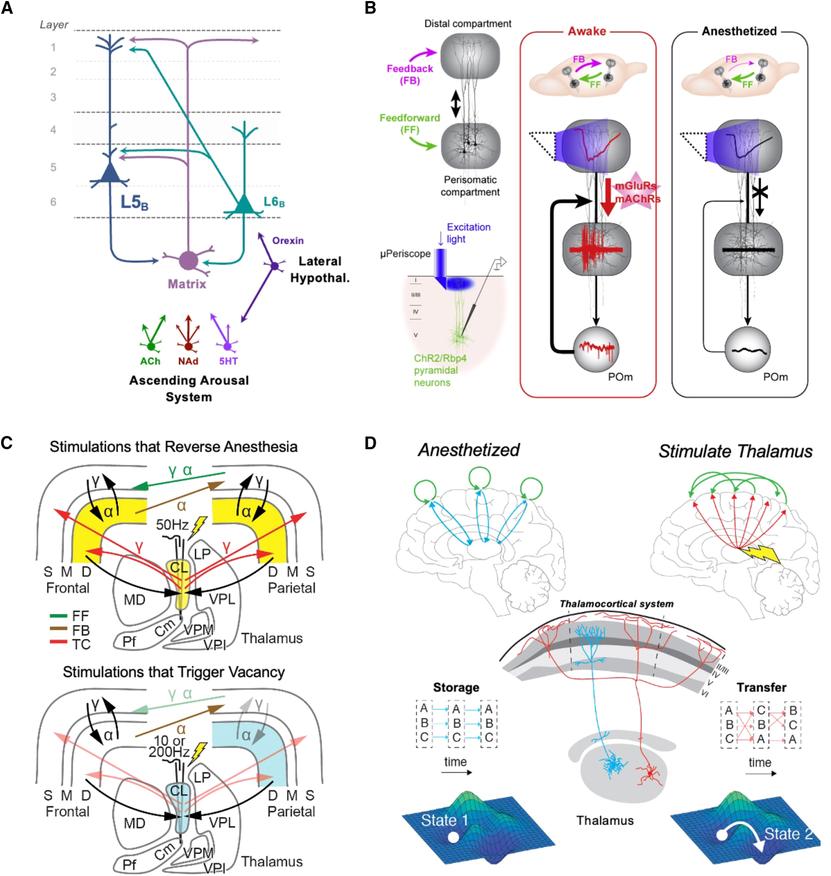 Взаимодействие матричных входов таламуса с корой головного мозга на разных масштабах для изменения состояния сознания (A) Таламокортикальные контуры, вовлеченные в состояние сознания. Матричные клетки таламуса (фиолетовые) являются важными мишенями ретикулярной активирующей системы. Они взаимно связаны с нейронами ttL5B (темно-синие) и идеально расположены для модуляции их возбудимости. Нейроны L6B, управляемые орексином, дополнительно модулируют эти таламокортикальные взаимодействия. (B) Во время бодрствования матричные входы таламуса возбуждают пирамидальные нейроны L5 через метаботропные глутаматергические входы к косым дендритам, позволяя кальциевым спайкам в апикальных дендритах влиять на соматическую активность. Под общей анестезией, в отсутствие таламического возбуждения, пирамидальные нейроны L5 не способны распространять сигналы от дендритов к соме, что способствует функциональному разобщению областей мозга. Рисунок адаптирован с разрешения Suzuki and Larkum.⁸⁰ (C) Минимально достаточный механизм, посредством которого DBS центрального латерального ядра (CL) таламуса восстанавливает или нарушает сознание. Верхняя часть: таламокортикальные (TC), прямые (FF) и обратные (FB) связи, наиболее измененные стимуляцией таламуса, которая успешно обращала общую анестезию (пропофол и изофлуран) у макак. Высокочастотная (50 Гц) DBS таламуса, одновременно подаваемая через 16 контактов линейного электрода (с шагом 200 мкм), центрированного в CL, имитирует паттерны активности бодрствующего состояния (желтый цвет), характерные для таламокортикальных эфферентов. Это увеличивает частоту разрядов в глубоких слоях коры (желтый цвет), что восстанавливает внутриколоночные, прямые и обратные связи на альфа- и гамма-частотах, несмотря на тормозное давление анестезии. Адаптировано с разрешения Redinbaugh et al.⁸¹ Нижняя часть: низко- (10 Гц) и очень высокочастотная (200 Гц) DBS, центрированная в CL, у бодрствующих макак вместо этого вызывает «пустое» состояние, схожее с симптомами абсансной эпилепсии. Низкая активность в таламусе и глубоких слоях коры (синий цвет) приводит к нарушению связей в теменных внутриколоночных контурах и разрыву прямых связей (светлая штриховка). На основе результатов Redinbaugh et al.⁸² (D) Крупномасштабная кортико-таламическая модель нейронных масс (включающая матричные и ядерные клетки таламуса), которая воспроизвела восстановление сознания при стимуляции таламуса после пропофоловой анестезии у макак. Симуляция стимуляции матричных, но не ядерных, клеток повышала кортикальную возбудимость, обеспечивая передачу информации между областями и более сложную, менее стереотипную динамику. На макроуровне это отразилось в «уплощении» общемозгового энергетического ландшафта, что типично для состояния бодрствования. Рисунок воспроизведен с разрешения Müller et al.⁸³Автор: Whyte, Christopher J. et al. Neuron, Volume 112 Источник: www.cell.com