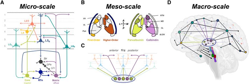 Микро-, мезо- и макроуровневая организация таламокортикальной системы (A) На микроуровне различные типы возбуждающих клеток в таламусе (ядерные [оливковый цвет] и матричные [сливовый цвет]) проецируются в различные слои (пронумерованные 1-6) коры головного мозга, где они контактируют со специфическими популяциями клеточных типов, которые оказывают различное влияние на кортикальные вычисления. Ядерные клетки посылают направленные проекции к звездчатым клеткам (L4, светло-оранжевый) в средних (зернистых) слоях, которые затем иннервируют пирамидальные нейроны в поверхностных (L2/3, мандариновый) и глубоких (L6A, бирюзовый) слоях, которые, в свою очередь, проецируются либо обратно в таламус (L6A), либо в пределах коры головного мозга (L2/3). В отличие от них, матричные клетки иннервируют поверхностные (L1) и глубокие (L5) слои, особенно нацеливаясь на крупные пирамидальные нейроны пирамидного тракта (PT-типа) с толстыми пучковыми дендритами (ttL5B, синий), которые являются единственным исходящим путем коры за пределы среднего мозга. И клетки ttL5B, и матричные клетки также тесно связаны с орексин-чувствительными пирамидальными нейронами слоя 6 (L6B, бирюзовый). Также существует обширный тормозной контроль над спайковой активностью таламуса: например, через ретикулярное ядро таламуса (RTn, темно-синий), которое возбуждается проекционными нейронами таламуса и кортикальными входами в таламус (не показано), и через внутренний бледный шар (GPi), который управляется входами от ttL5B к наружному бледному шару (GPe, средне-серый). NB: это идеализированная схема, предназначенная для общего обзора основных контуров, поэтому на ней показаны не все известные связи. (B) Различные ядра таламуса можно охарактеризовать в соответствии с их принадлежностью к (слева) первому порядку (светло-оранжевый) или высшему порядку (коричневый), в зависимости от того, поступают ли управляющие (драйверные) входы из подкорковых структур или из коры головного мозга соответственно; а также (справа) по экспрессии парвальбумина (в ядерных клетках) и кальбиндина (в матричных клетках). Обратите внимание, что отдельные ядра содержат смесь обоих типов клеток (что приблизительно показано относительной интенсивностью цвета; распределение внутри отдельных ядер не изображено). (C) На мезоуровне предполагается, что таламус контролирует локальную (через ядерные клетки) и дальнодействующую (через матричные клетки) возбудимость распределенных областей коры головного мозга посредством проекций, которые усиливают локальный или распределенный резонанс в кортико-таламических петлях по всей мантии коры. (D) На макроуровне таламус тесно взаимосвязан со всей мантией коры посредством аксональных связей, исходящих как из коры головного мозга, так и из таламуса, которые вместе образуют распределенную сеть, формирующую сознательный опыт. Особую важность имеет наличие в одной и той же системе как конвергентной (несколько кортикальных областей проецируются в одну область таламуса), так и дивергентной (одна область таламуса проецируется в несколько кортикальных областей) архитектуры. Гипоталамус (пунктирная линия) проецируется на множество узлов в восходящей системе возбуждения, где специализированные клетки высвобождают различные нейромодулирующие нейрохимические вещества (дофамин, светло-голубой; ацетил