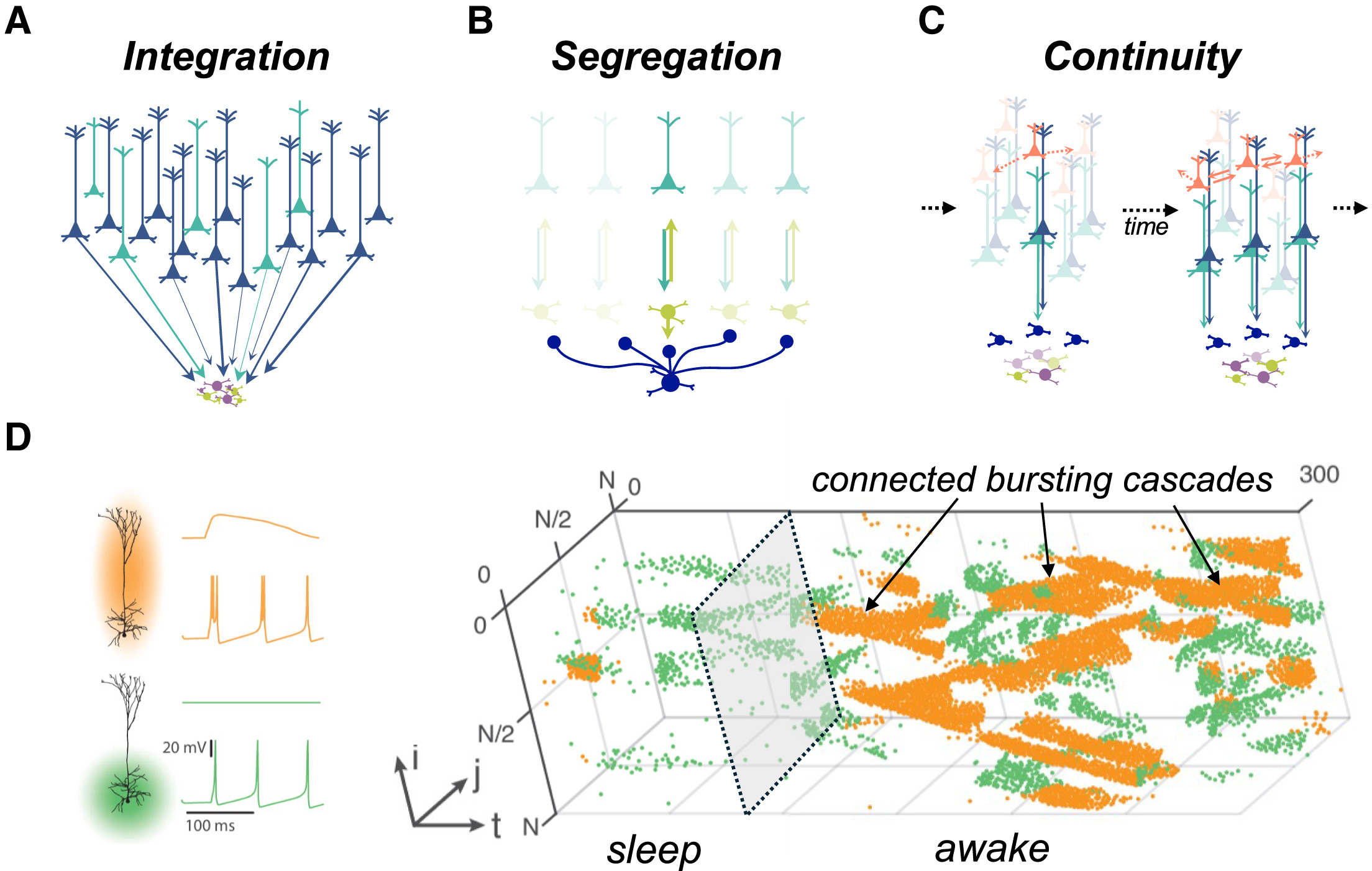 Вклад таламуса в характер содержания сознания (A-C) Ограничения, налагаемые на текущую динамику организацией таламуса, могут помочь объяснить ключевые особенности обработки сознательной информации, такие как (A) интеграция, которая, как мы утверждаем, возникает в результате снижения размерности, налагаемого сходящимися входами на меньшее количество клеток в таламусе (нижний ряд) по сравнению с корой головного мозга (верхний ряд); (B) сегрегация, которая является естественным побочным продуктом процесса, подобного разделяющей нормализации, возникающего из-за зависимого от активности привлечения тормозного ретикулярного ядра таламуса (темно-синий); и (C) непрерывность, при которой сочетание управляющей (драйверной) и модулирующей ролей в таламусе налагает «эффект Матфея» на клеточные популяции, что дает импульс активности нейронам, связанным с текущим доминирующим таламокортикальным ансамблем. Цвета клеток в (A)-(C) соответствуют цветам на Рисунках 1, 2 и 3. (D) Была создана спайковая нейронная модель для имитации ключевой особенности клеток ttL5B, а именно, их перехода от режима регулярных спайков (зеленый; вход только к базальным дендритам) к режиму вспышек (оранжевый; одновременная активация апикальных и базальных дендритов), когда он управляется матричными входами таламуса. После настройки модели по электрофизиологическим данным, полученным от макак под анестезией/бодрствующих и естественно спящих, авторы показали, что область в пространстве параметров модели, которая лучше всего соответствует сну, была связана с преимущественно регулярной спайковой активностью (зеленые точки), тогда как в режиме бодрствования (следуя за серой пунктирной моделью), модельные нейроны ttL5B (встроенные в кортикальный слой размером N = 100 x 100) были способны переходить в режим вспышек, который, в свою очередь, запускал вспышки в синаптически связанных нейронах, приводя к устойчивой активности, которая могла когерентно распространяться по кортикальному слою — процесс, названный «связанные каскады вспышек». (D) было адаптировано из Munn et al.¹⁴⁸ с разрешения. Обратите внимание, что эти механизмы предназначены лишь для того, чтобы передать правдоподобные, но не исчерпывающие способы реализации каждой из этих особенностей.Автор: Whyte, Christopher J. et al. Neuron, Volume 112 Источник: www.cell.com