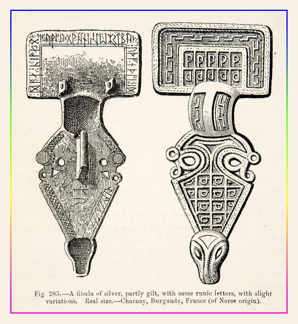 Фибула из Шарнэ с надписью на бургундском языке. Текст написан руническим алфавитом — вероятно, в бургундском языке не было своего. По одной из версий, на броши написано «пусть Лиано найдет Идду». Источник: periodpaper.com.