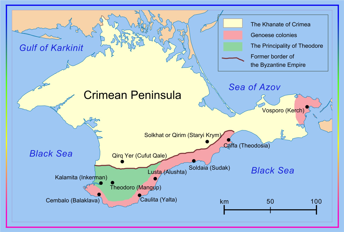 Крым в середине XV века. Зеленым цветом выделена территория Феодоро, или Готии — государства, где сохранилась крупная община готов. О Феодоро мы рассказывали чуть больше в тексте о крымских готах*. Источник: Wikipedia