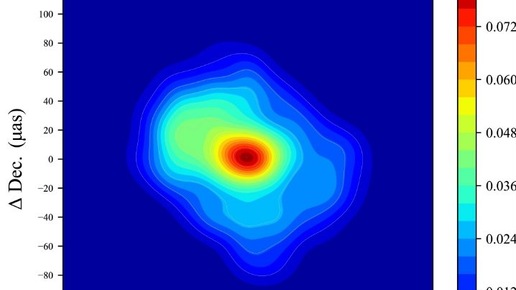На изображении 2022 года аккреционный диск выглядит как кольцо с тремя крупными сгустками. У японских ученых получилась совсем другая картина: вещество вокруг черной дыры оказалось распределено так, что в результате наблюдается явно вытянутая структура. Она простирается примерно в направлении с востока на запад относительно Земли. При этом правая часть заметно ярче левой.