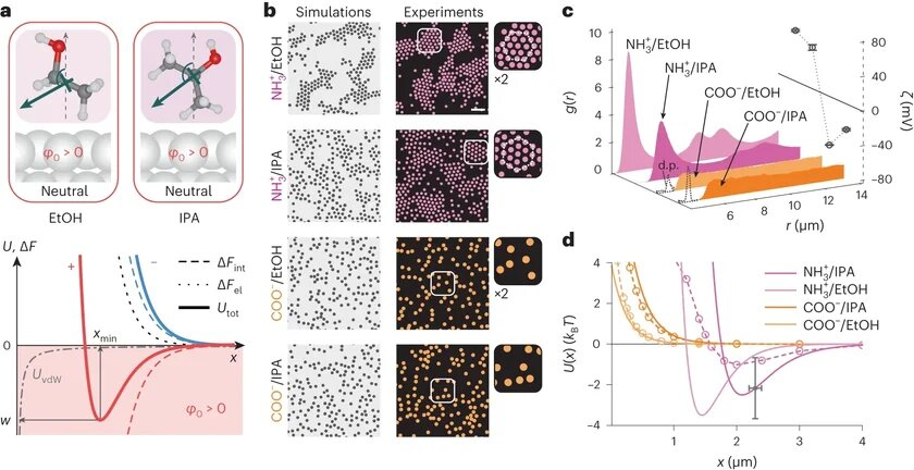 Естественно, ученые задались вопросом, можно ли переключить воздействие на заряженные частицы таким образом, чтобы положительно заряженные частицы образовывали кластеры, а отрицательно заряженные — нет. Заменив растворитель на спирты, такие как этанол, который имеет другое поведение на границе раздела с водой, они наблюдали именно это: положительно заряженные частицы аминированного диоксида кремния образовывали гексагональные кластеры, тогда как отрицательно заряженные частицы кремнезема этого не делали.