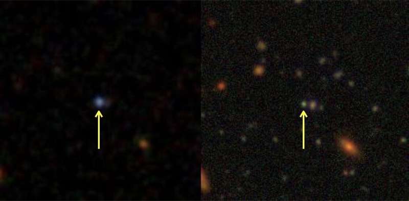 Изображения галактики J0218−0036 (красное смещение 1,8; расстояние около 10 миллиардов световых лет), отмеченные желтыми стрелками. Изображение слева получено в рамках проекта «Слоановский цифровой небесный обзор» (SDSS), а изображение справа — с помощью камеры Hyper Suprime-Cam (HSC) на телескопе «Субару». Поскольку HSC обладает более высокой чувствительностью, чем SDSS, на изображении HSC видно много дополнительных слабых объектов. Сравнение яркости на двух снимках показывает, что галактика сильно потускнела в период с 2002 года (SDSS) по 2018 год (HSC). Источник: SDSS, HSC-SSP/NAOJ